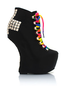 The classic leather look, mixed with the multi colored laces, with the trendy cross stud flowing fiercely at the back of an enclaved wedge! I'M IN LOVE!!!