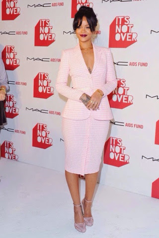 Rihanna was recently in L.A. at the MAC Cosmetics premiere of It’s Not Over where the pop mogul was recognized as being one of the most successful spokespersons for MAC. Of course, being the bad a** that RiRi is, she used this as a window to kill us w/ an attempt at business casual—and as you can see, it was her best! This office-inspired outfit, was curated by her pairing Altuzarra's pale pink gingham skirt suit from the spring 2015 collection, with a pewter Jesus-Sandal strapped pump, along with a super chic chignon that totally SOLD this proper & prim look. Rihanna made sure that the look maintained her signature edge though, she wore a plum lippie, and her sternum was very much visible; serving us with that twist that we so love about her.